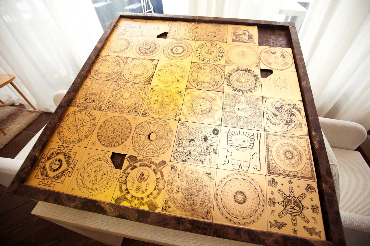 Площадка поделена на 36 квадратов (по шесть с каждой стороны). Поверхность площадки закрыта 35 плитками — они свободно передвигаются по горизонтали и вертикали. У трех плиток спилен один из углов.